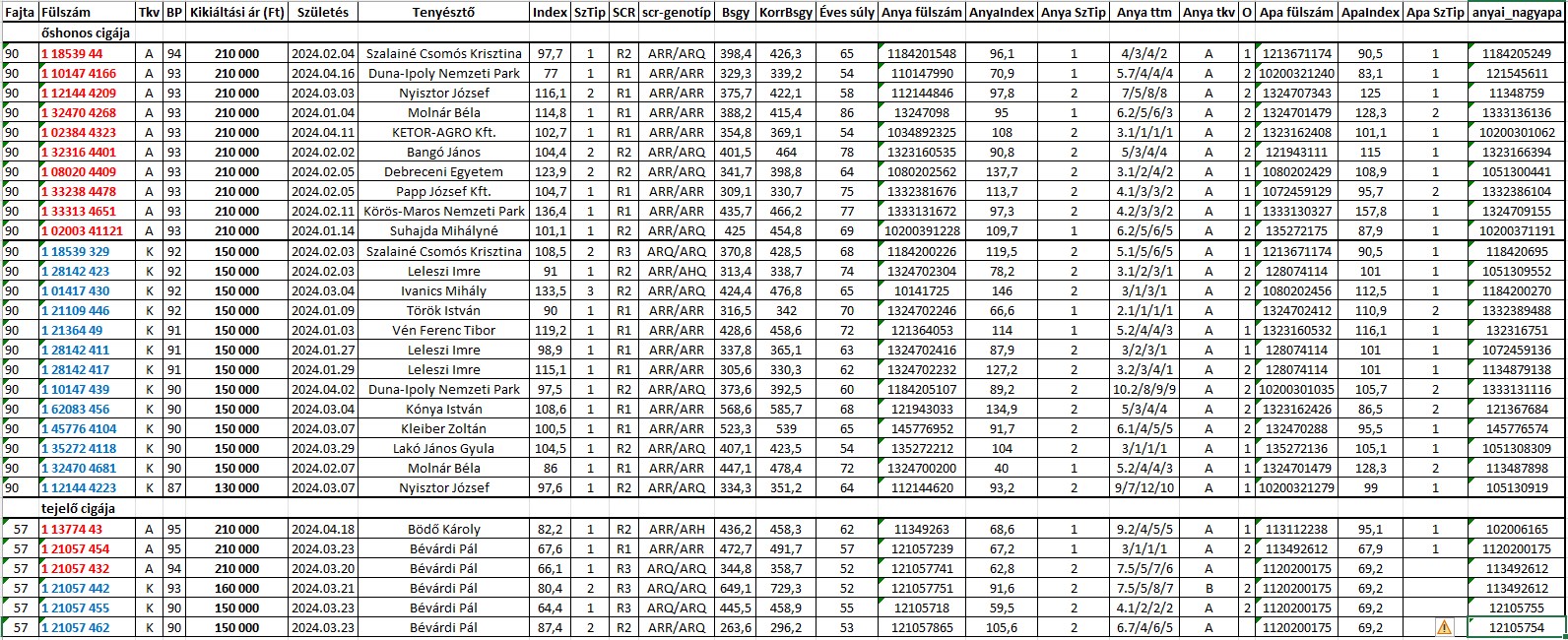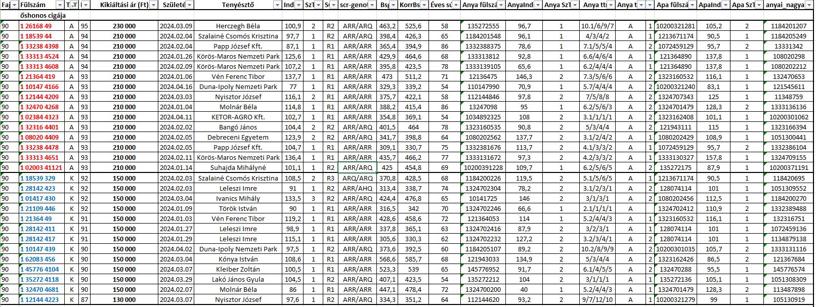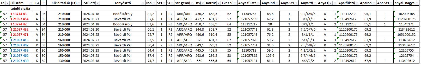 Az értékesítésre kerülő kosok egyedenként meghatározott értékesítési ára, néhány fontosabb származási és termelési adata az alábbi táblázatokra (tejelő cigája és cigája) kattintva olvasható. A jobb oldali táblázatban a pót-értékesítésre kerülő egyedek adatai láthatók.
