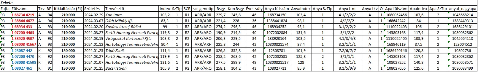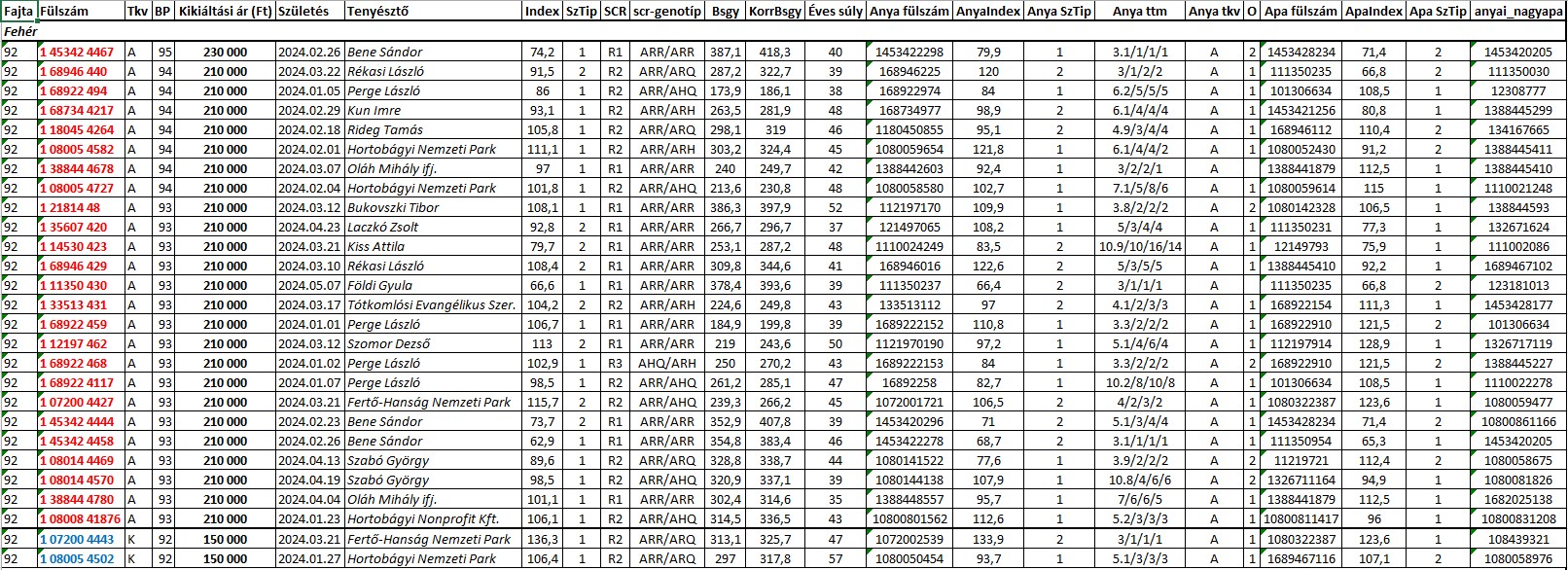 Az értékesítésre kerülő kosok egyedenként meghatározott értékesítési ára, néhány fontosabb származási és termelési adata az alábbi táblázatra kattintva olvasható.