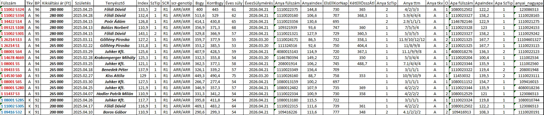 Az árverésre kerülő kosok adati és kikiáltási áruk az alábbi táblázatban megtalálhatók.