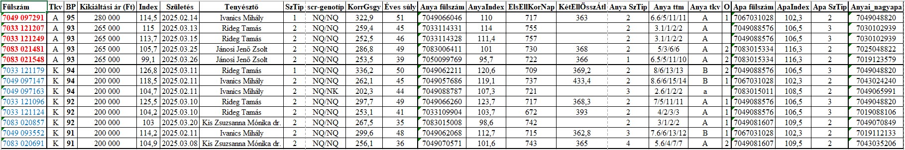 Az értékesítésre kerülő bakok egyedenként meghatározott értékesítési ára, néhány fontosabb származási és termelési adata az alábbi táblázatra kattintva olvasható.